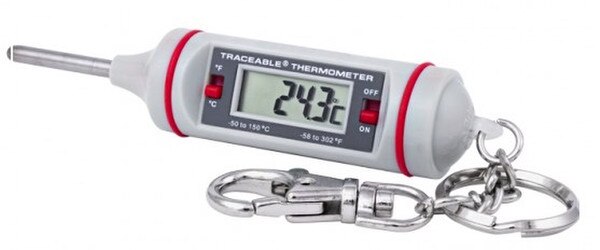 Pocket-size Key-Chain Thermometer is perfect for carrying with you. Clip to a lab coat buttonhole, jacket zipper, or belt loop, or use it with your keys. Hang in storerooms or fume hoods for easy monitoring. Fast, one-second response makes it ideal for measuring ambient air temperature. One-inch stainless-steel probe is designed for penetration of semi-solids and liquid measurements. Provides accurate readings when immersed only 1/3-inch.