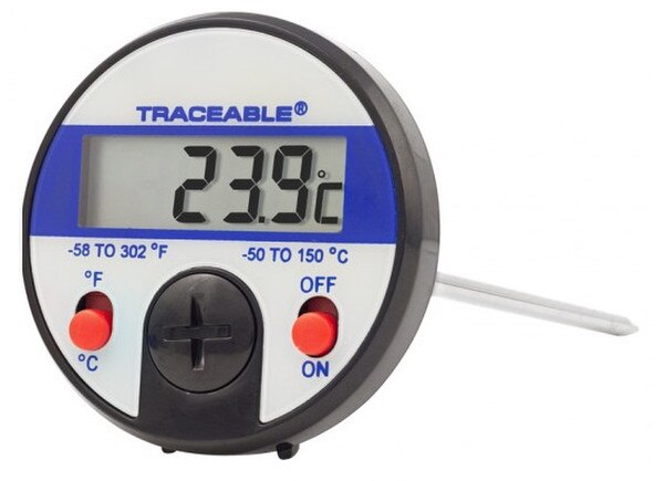 Dedicate this thermometer to a specific test. Provides continuous monitoring for over a year. Wide range of –58 to 302°F/–50 to 150°C covers 90 percent of lab temperature measurements. To achieve this temperature range with equivalent precision would require over 150 mercury thermometers. Enjoy digital resolution of 0.1° from –20 to 200° (1° outside this range). Accuracy is ±0.3°C at tested points, ±1°C between –20 and 100°C otherwise. Readings are updated every second. Extra-large, easy-to-read display is 3/8-inch-high. Bright LCD is easier to read than eye straining guesses at pointers or mercury positions.