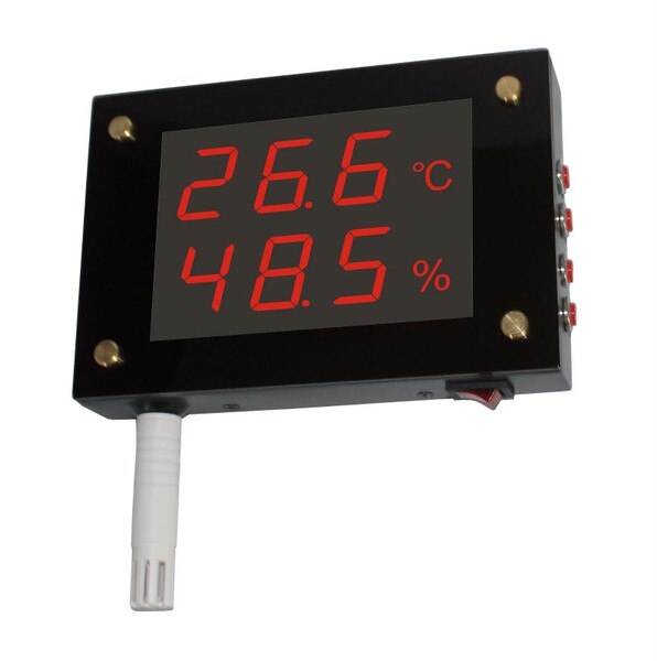 Easily measure temperature and humidity with 10 Ft. external sensors. Allows for Field calibration function 1.2" Large LED displays temperature and humidity readings. Includes 12VDC adapter power supply and Wall Hanging.