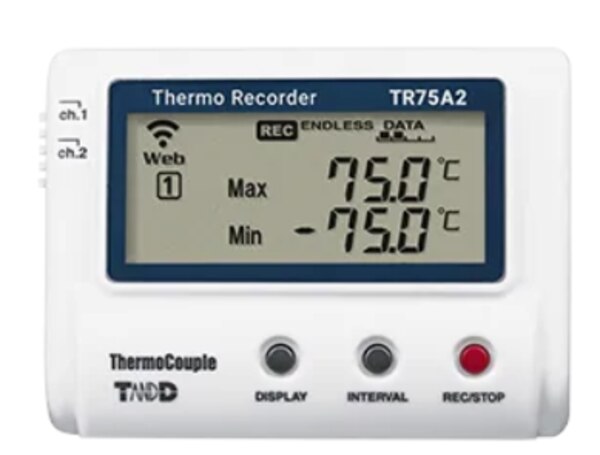 The TR75A2 is a temperature logger with two thermocouple (K, J, T, E, S, R) sensor connections. It is capable of measuring temperatures ranging from -199 to 1760°C and can be used in very high temperatures, such as in a plant furnace or in deep freezers, where temperatures reach very low levels.