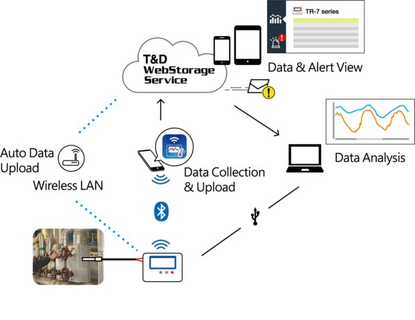 Functional buttons on the device allow you to make settings and start/stop recording. Use the wireless LAN feature to automatically upload data to the Cloud for anytime, anywhere access, and receive warning notices. Bluetooth communication allows you to view data, create reports, and make settings from a smartphone or tablet. Connect to a PC with a USB cable to download recorded data, create reports, and make setting changes.