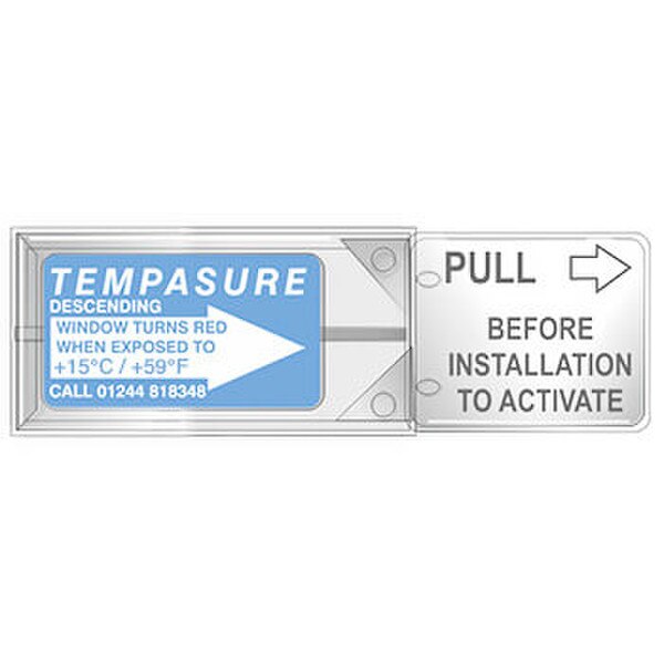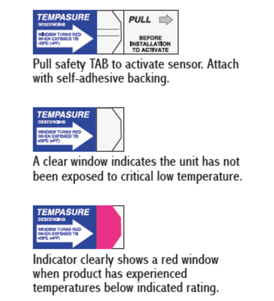 Tempasure with self-adhesive backing. To activate the operator must condition the label ABOVE the desired temperature and pull the activation tab. The unit will clearly show a red window when the product to which it is attached has experienced a temperature BELOW its rating.
