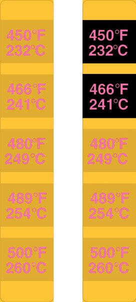 Thermostrip DC, a highly accurate heat indicator designed to assist with the drying, curing, laminating or bonding process. Each individual 10 mm X 56 mm self-adhesive strip has 5 temperature settings that when exposed to the rated temperature will permanently change color from silver to black indicating attained temperature